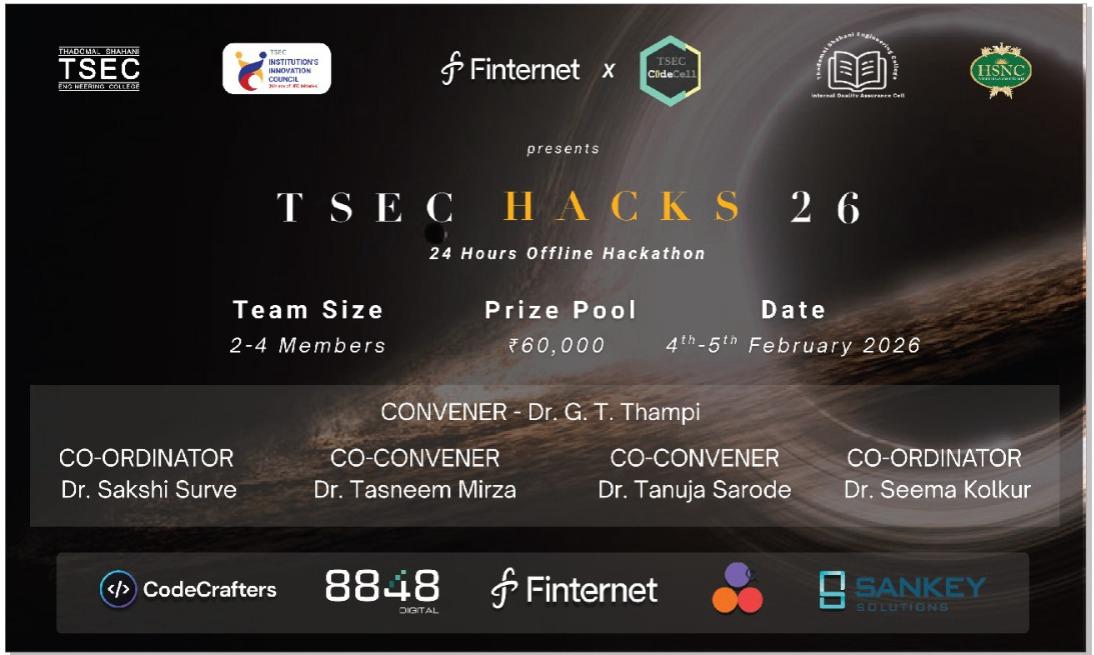 Tech-a-thon TSEC HACKS Alumni Meet 2024. ISTE Approved One Week FDP on “Graph Data Science with hands-on in Neo4j” AICTE ATAL Sponsored FDP on “AI in Supply Chain Management of Agriculture Produce” International Conference Brochure 2023 Shazam 2023 TSEC Marathon 2023 TSEC Contingent Auditions Chemegence 2023 TSEC Code Tantra Hackathon 2023 Internal Smart India Hackathon Concovation 2023 Alumni Meet on 14th Jan 2023